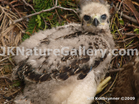The beginning of tail feathers starting to grow on the eyass. Photo