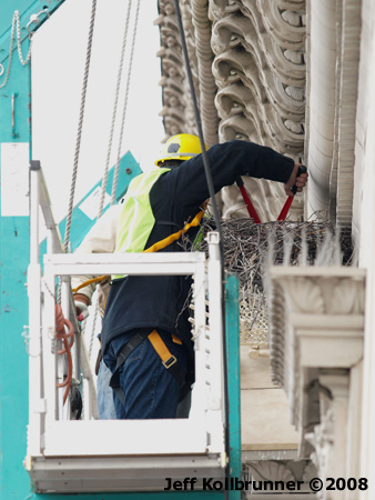 Work continues removing the pigeon spikes from the nest